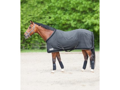 Hřejivá bederní deka z fleecu s výřezem na sedlo. Suchý zip na kohoutku a šňůra pod ocasem zajišťují dobré uchycení koni.