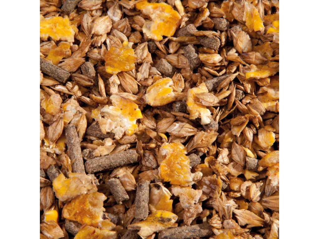 Složení: ječné vločky, kukuřičné vločky, ovesné otruby, řepná melasa, cukrovarské řízky, vojtěšková moučka, pšeničné otruby, uhličitan vápenatý, kukuřice, ječmen, ostropestřecový olej, chlorid sodný, dikalciumfosfát, fermentovaný extrakt (EMH), oxid hořečnatý.