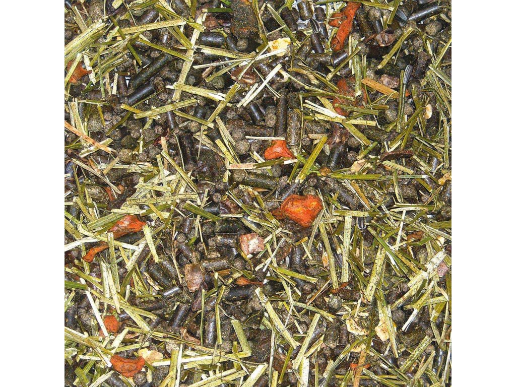Složení: vojtěšková moučka, sušené jablečné výlisky, vojtěškové seno, lněný a slunečnicový extrahovaný šrot, lignocelulosa, šrotovaný svatojánský chléb, rýžové otruby, slunečnicové semeno, sušená mrkev, ostropestřecový olej, řepná melasa, uhličitan vápenatý, fermentovaný rostlinný extrakt EMH, chlorid sodný, smetanka lékařská, listy hlohu, artyčok, listy gingo biloba, ostropestřec mariánský.