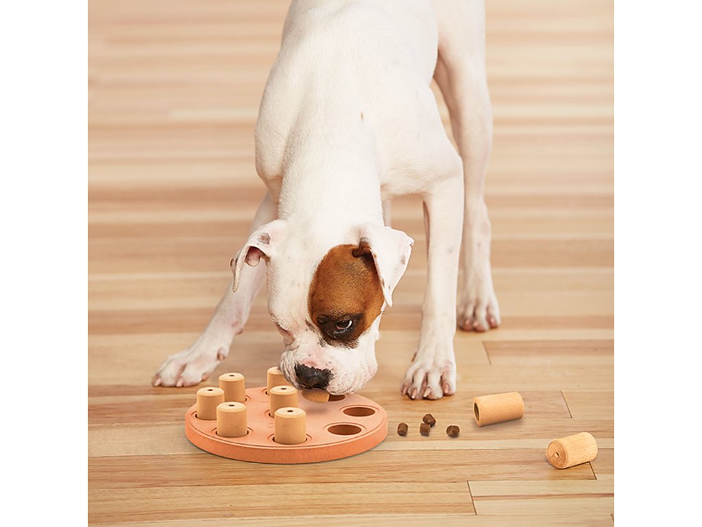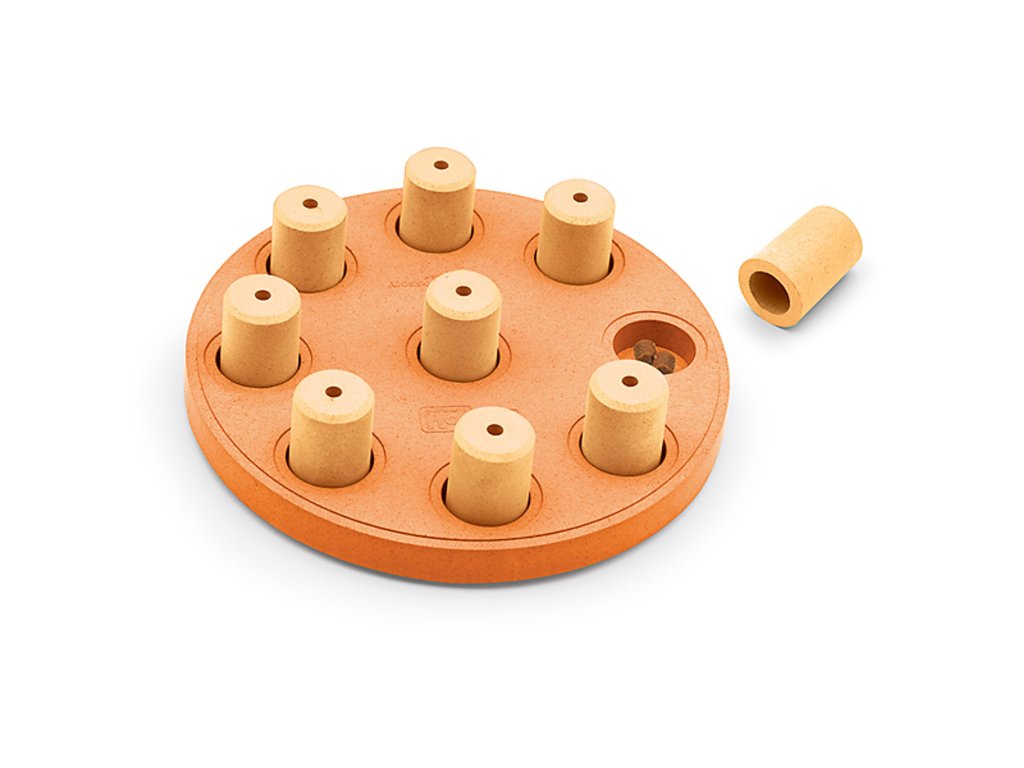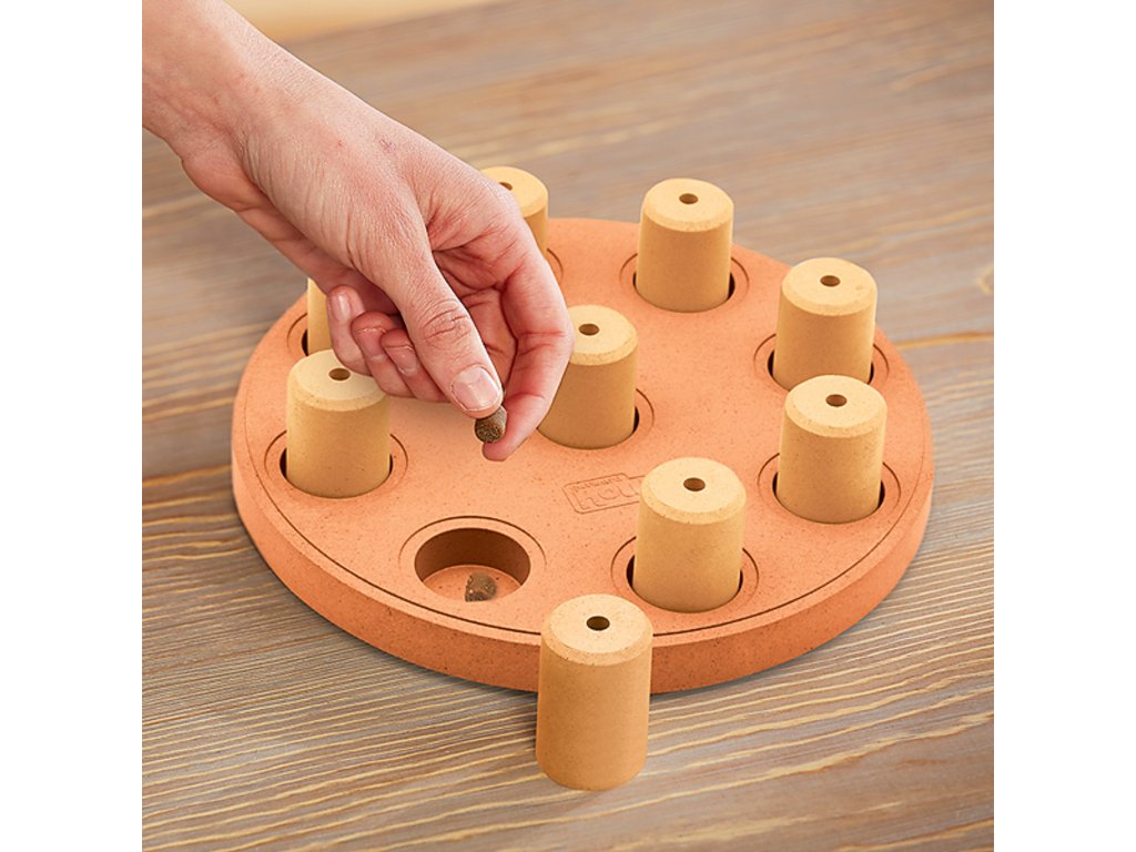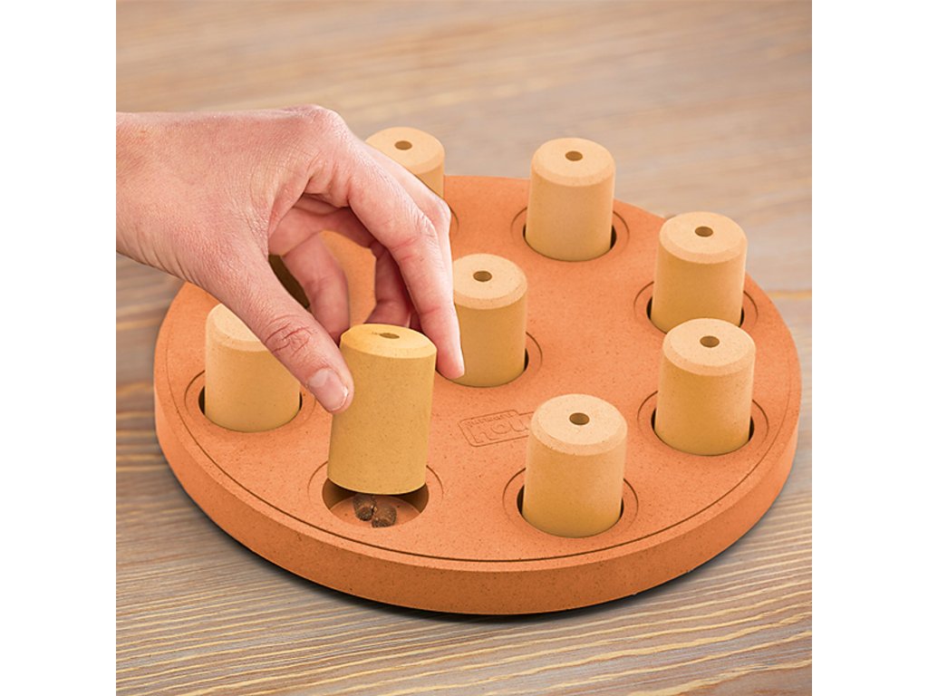 - Vyndejte z hlavolamu všechny kolíky, do každého otvoru umístěte pamlsek a znovu přikryjte.