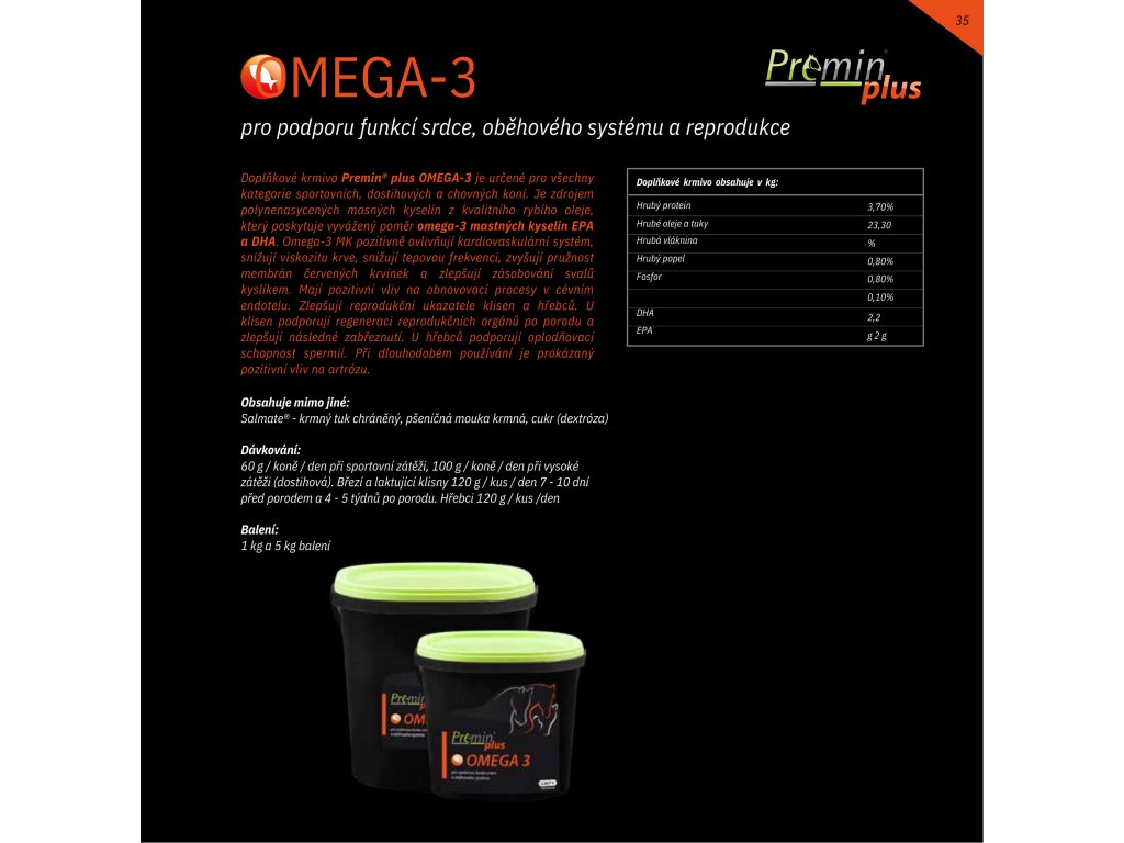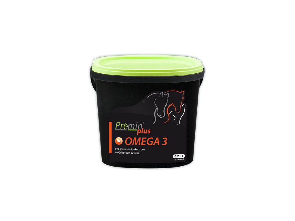 Doplňkové krmivo Premin® plus OMEGA-3 je určené pro všechny kategorie sportovních, dostihových a chovných koní. Je zdrojem polynenasycených masných kyselin z kvalitního rybího oleje, který poskytuje vyvážený poměr omega-3 mastných kyselin EPA a DHA. Omega-3 MK pozitivně ovlivňují kardiovaskulární systém, snižují viskozitu krve, snižují tepovou frekvenci, zvyšují pružnost membrán červených krvinek a zlepšují zásobování svalů kyslíkem. Mají pozitivní vliv na obnovovací procesy v cévním endotelu. Zlepšují reprodukční ukazatele klisen a hřebců. U klisen podporují regeneraci reprodukčních orgánů po porodu a zlepšují následné zabřeznutí. U hřebců podporují oplodňovací schopnost spermií. Při dlouhodobém používání je prokázaný pozitivní vliv na artrózu.