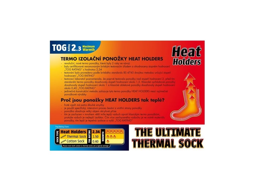 Stabdardní TERMO ponožky mají stupeň hodnocení „TOG RATING“ okolo 1,5, klasické oblekové ponožky mají stupeň 0,40. Jedinečná kontrukce úpletu a následné zušlechtění řadí tyto termoponožky HEAT HOLDERS mezi výjimečné výrobky.