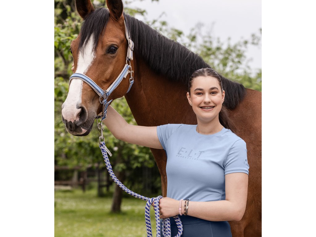 Na přední straně je tričko ozdobeno výrazným nápisem E·L·T v kombinaci fóliového potisku a jemných třpytivých kamínků, rukáv pak doplňuje decentní logo E·L·T. Jednoduchý, ale elegantní design zaručí, že tričko snadno zkombinujete s jakýmkoliv jezdeckým i volnočasovým outfitem.