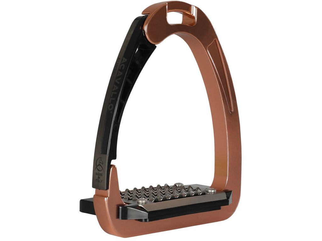 Třmeny Acavallo Arena Alupro se vyznačují patentovaným bočním otevíráním, vyvinutým po letech výzkumu a vývoje. Jejich technické složení pochází z kombinace high-tech kovu a polymerů vyrobených inovativní a patentovanou technikou vstřikování. Díky svému designu a konstrukci, která je založena na pružných polymerech, poskytuje třmen jezdci pocit menší tuhosti a většího pohodlí ve srovnání s běžnými produkty. Horní část lavice je vyrobena z nerezové oceli a vyznačuje se dlouhými horizontálními otvory, které zabraňují hromadění písku a nečistot, aby byla zajištěna optimální přilnavost za všech podmínek; nerezová ocel jej také chrání před korozí, a proto zaručuje dlouhou životnost produktu. Otvor napěťového uzamykacího a uvolňovacího mechanismu je umístěn o jeden centimetr výše než oxidovatelná ocelová část, aby se zajistilo, že noha nemůže omylem sklouznout do strany a aby písek a nečistoty nezdržovaly otevření polyamidového ramene v případě nouzový.• vyrobeny z High-Tech materiálů