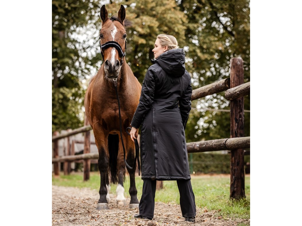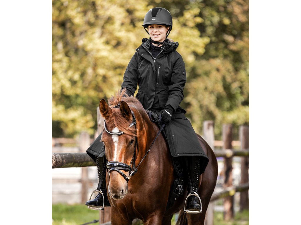 Tento vysoce funkční zimní jezdecký kabát splňuje všechny podmínky pro maximální pohodlí a ochranu v chladných dnech. Kabát má lehce vypasovaný střih a nastavitelnou šířku v pase. . Voděodolnost 5 000 mm a prodyšnost 3 000 g/m²/24h zajistí, že zůstanete v suchu a pohodlí. Odepínací kapuce s wattovaným kšiltem a reflexními prvky je praktická a elegantní. Dvě velké kapsy s fleecovou podšívkou udrží vaše ruce v teple, zatímco řešení zadního dílu je praktické pro pohodlnou jizdu na koni na koni.Materiál: