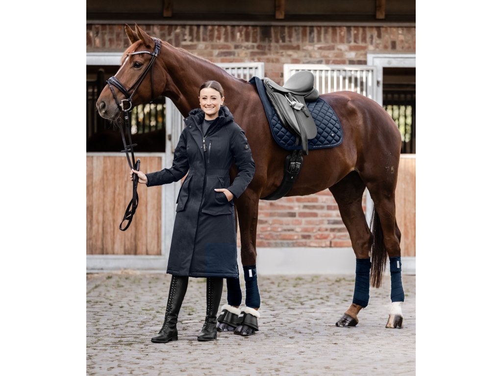 Tento vysoce funkční zimní jezdecký kabát splňuje všechny podmínky pro maximální pohodlí a ochranu v chladných dnech. Kabát má lehce vypasovaný střih a nastavitelnou šířku v pase. . Voděodolnost 5 000 mm a prodyšnost 3 000 g/m²/24h zajistí, že zůstanete v suchu a pohodlí. Odepínací kapuce s wattovaným kšiltem a reflexními prvky je praktická a elegantní. Dvě velké kapsy s fleecovou podšívkou udrží vaše ruce v teple, zatímco řešení zadního dílu je praktické pro pohodlnou jizdu na koni na koni.Materiál: